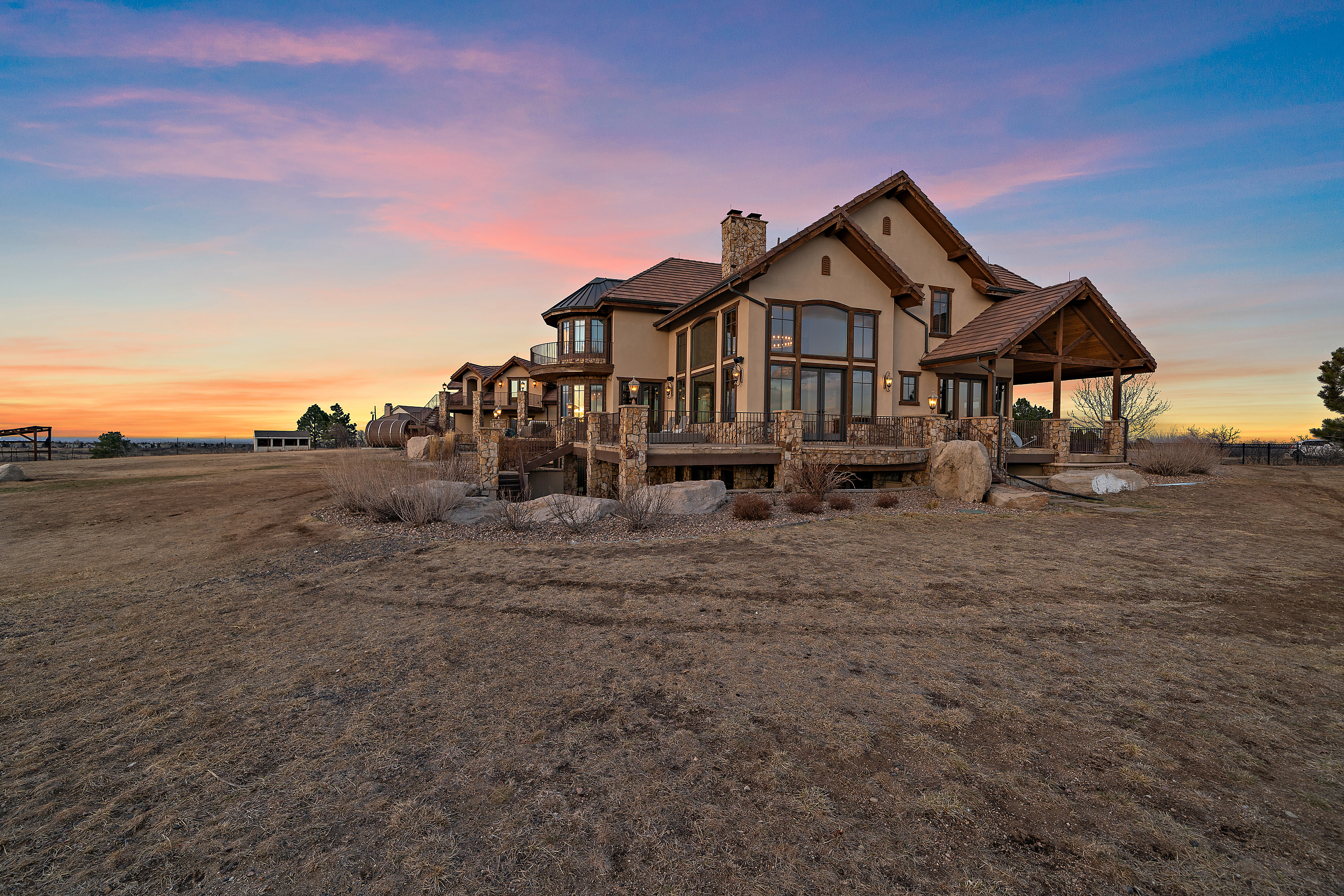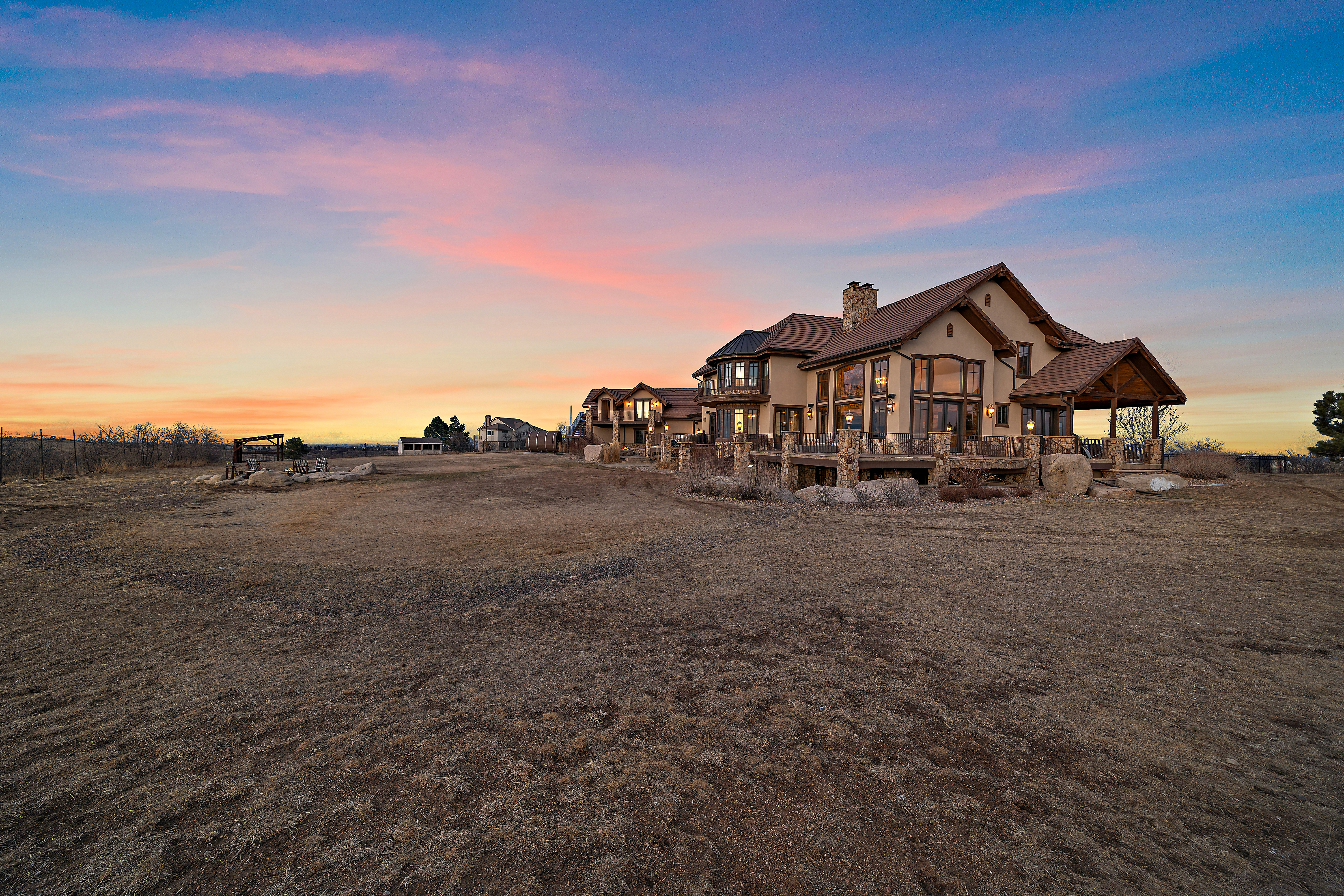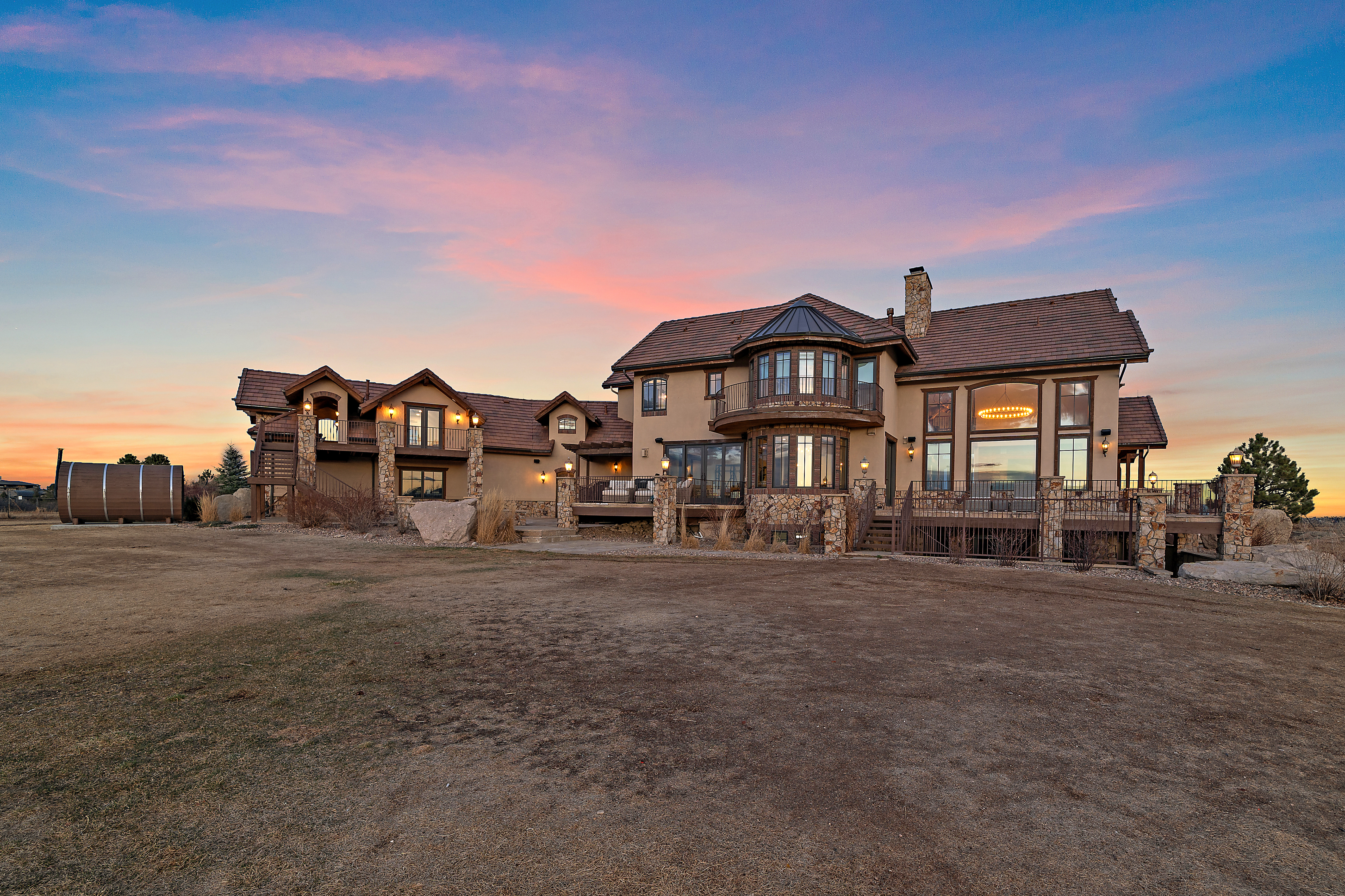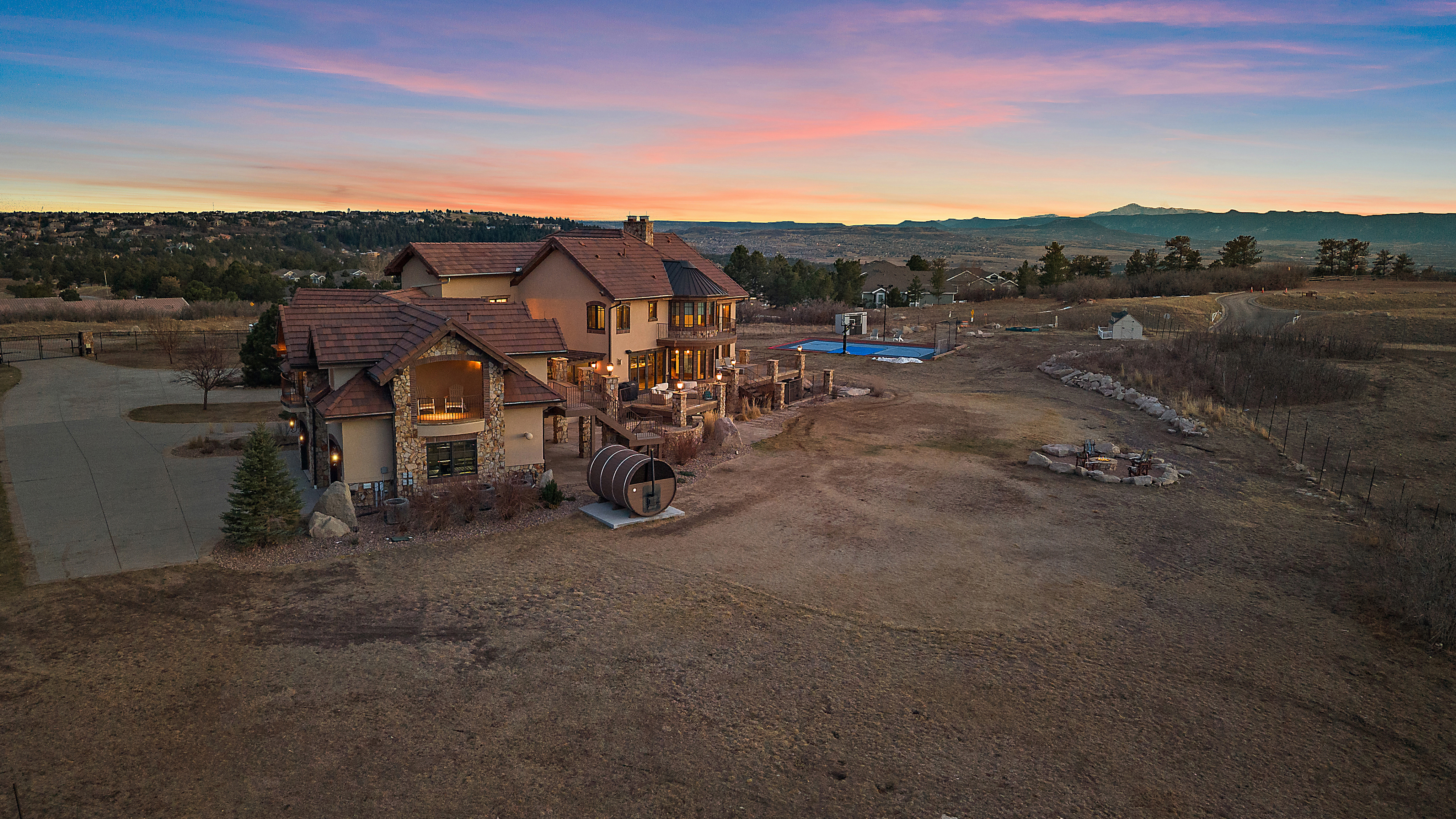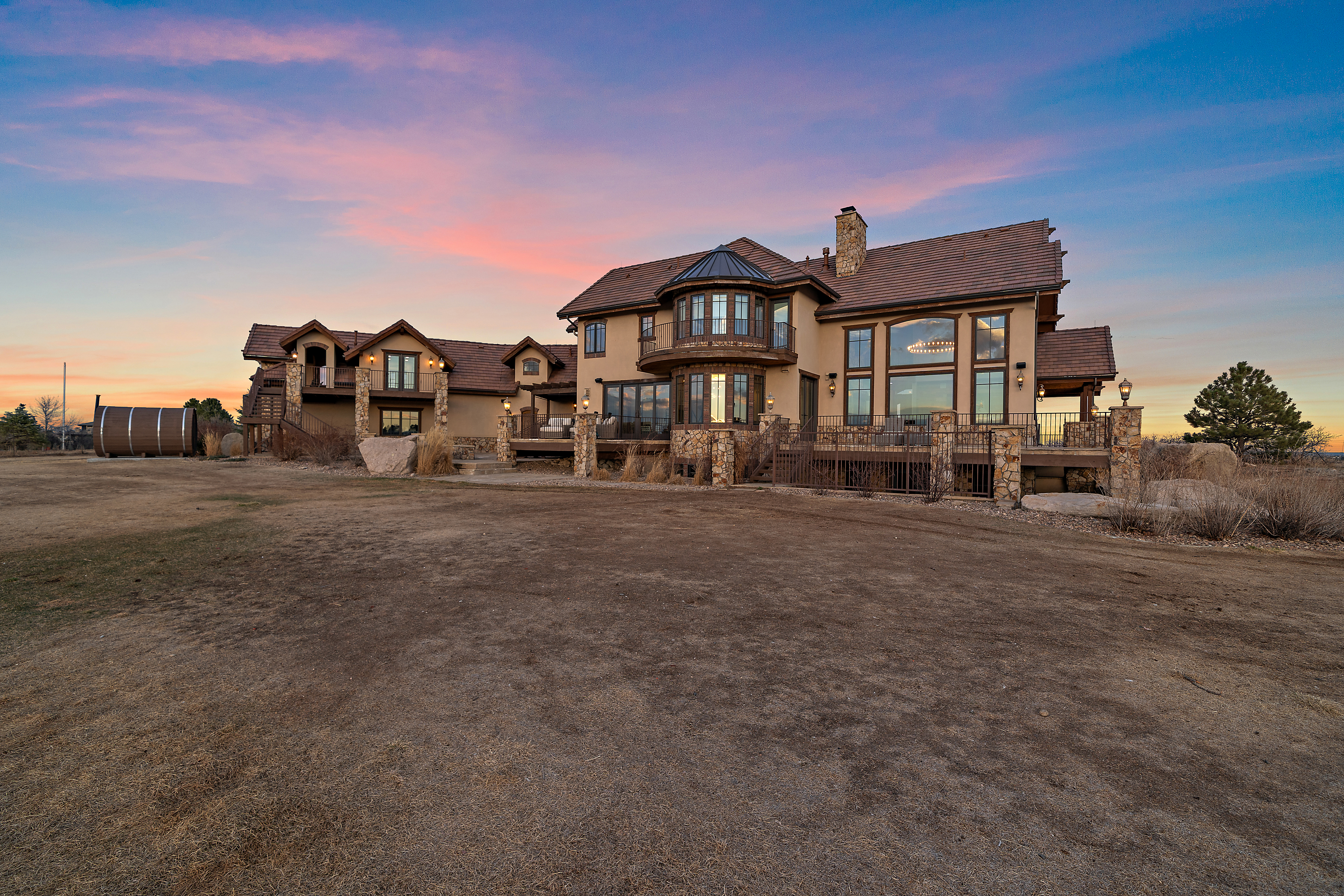 Unobstructed mountain views and true no HOA freedom define this custom estate on Buffalo Ridge. From Pikes Peak down toward downtown Denver, the entire west side of the home is oriented to the panorama, so the mountains, sunsets and wildlife are a constant backdrop from the great room, family room, kitchen, formal living area, primary suite and even the primary bath. The house sits high along Buffalo Ridge above Daniels Park and its bison preserve, tying directly into a larger system of protected rimrock open space, so you are looking over land that is intended to stay open rather than future rooftops. Every major space was designed around the view corridor: the wing over the garage, the main gathering rooms and the upper‑level primary with its curved sitting area and private balcony all face open land, with regular sightings of buffalo in Daniels Park along with elk, deer, hawks and eagles.