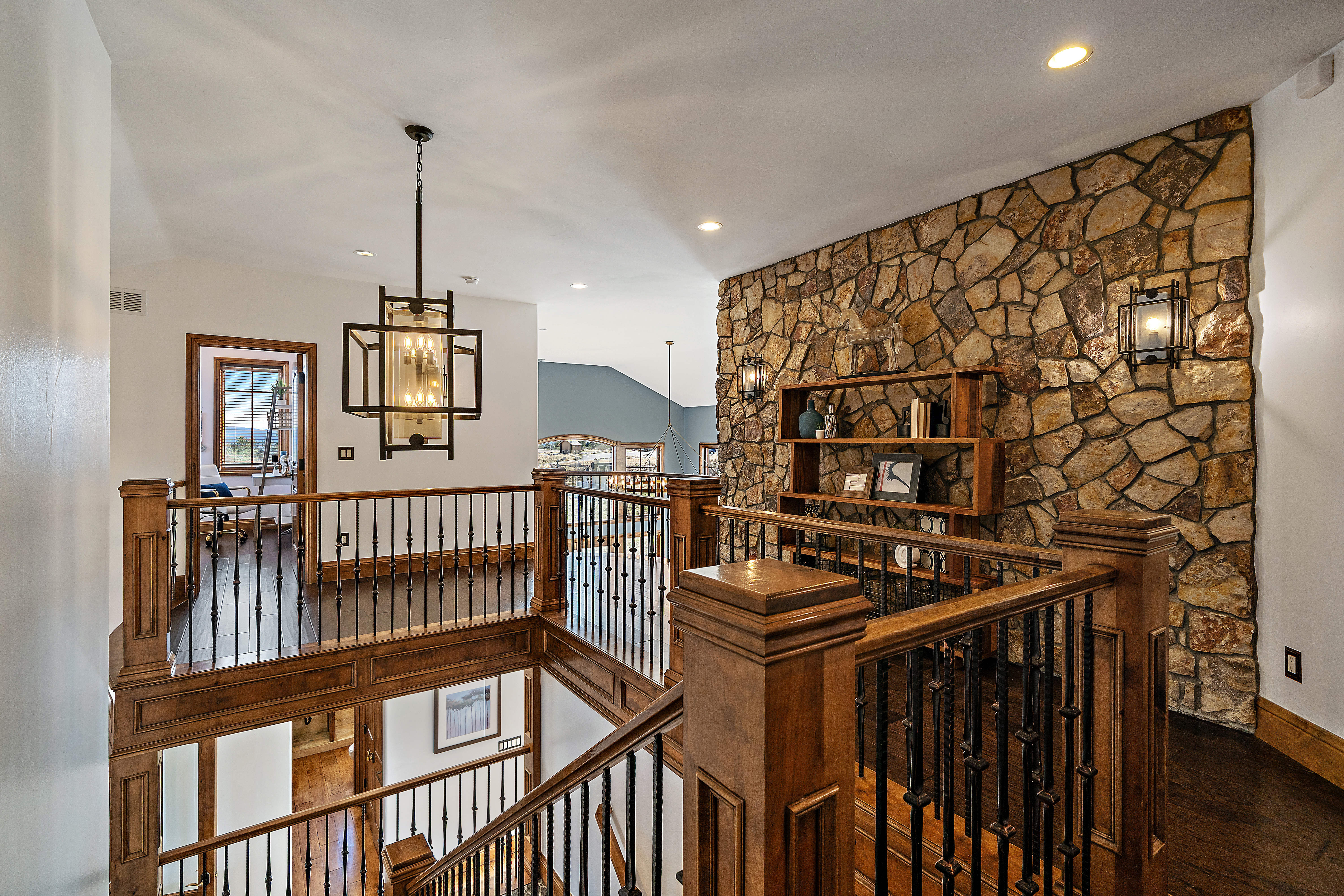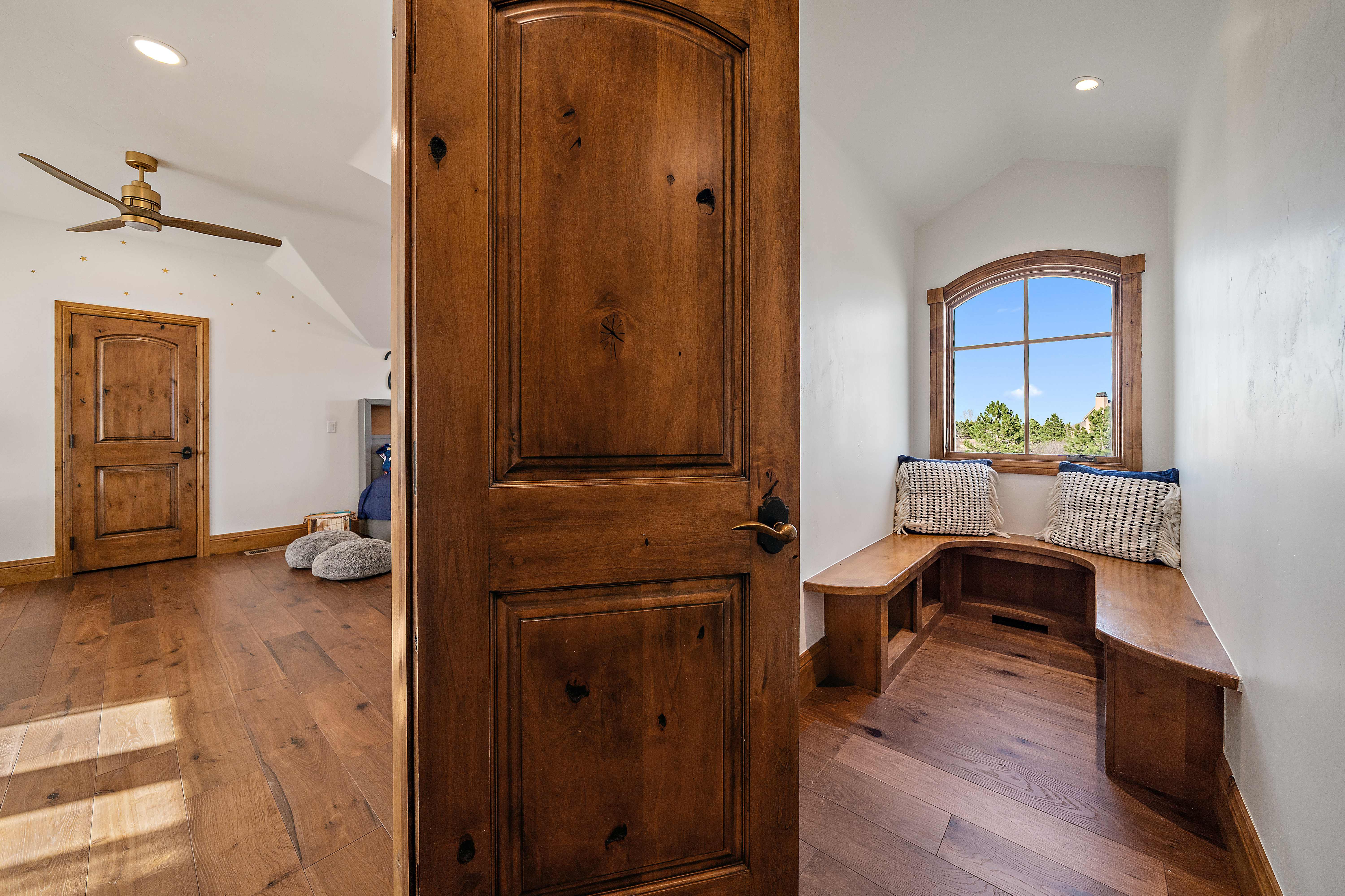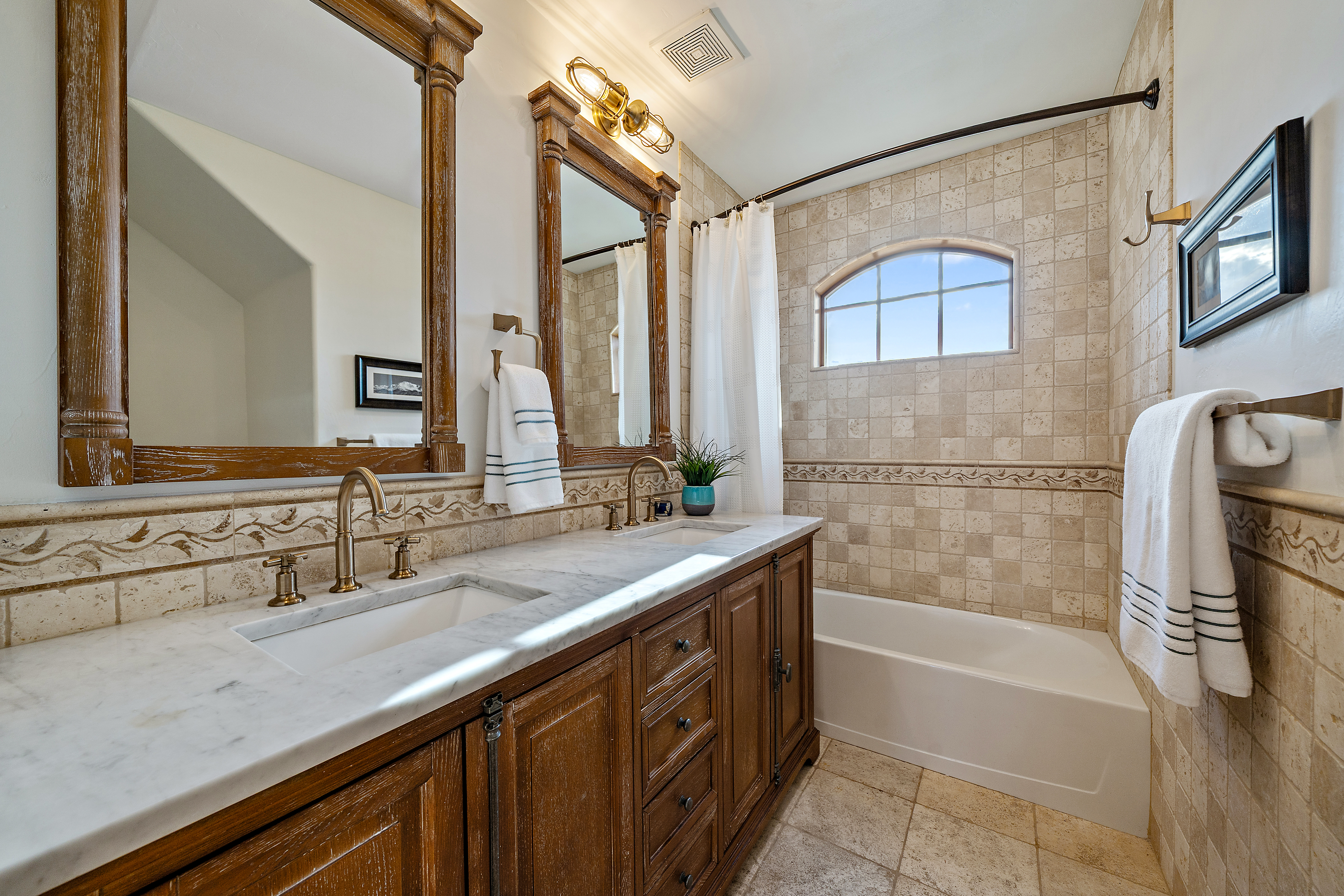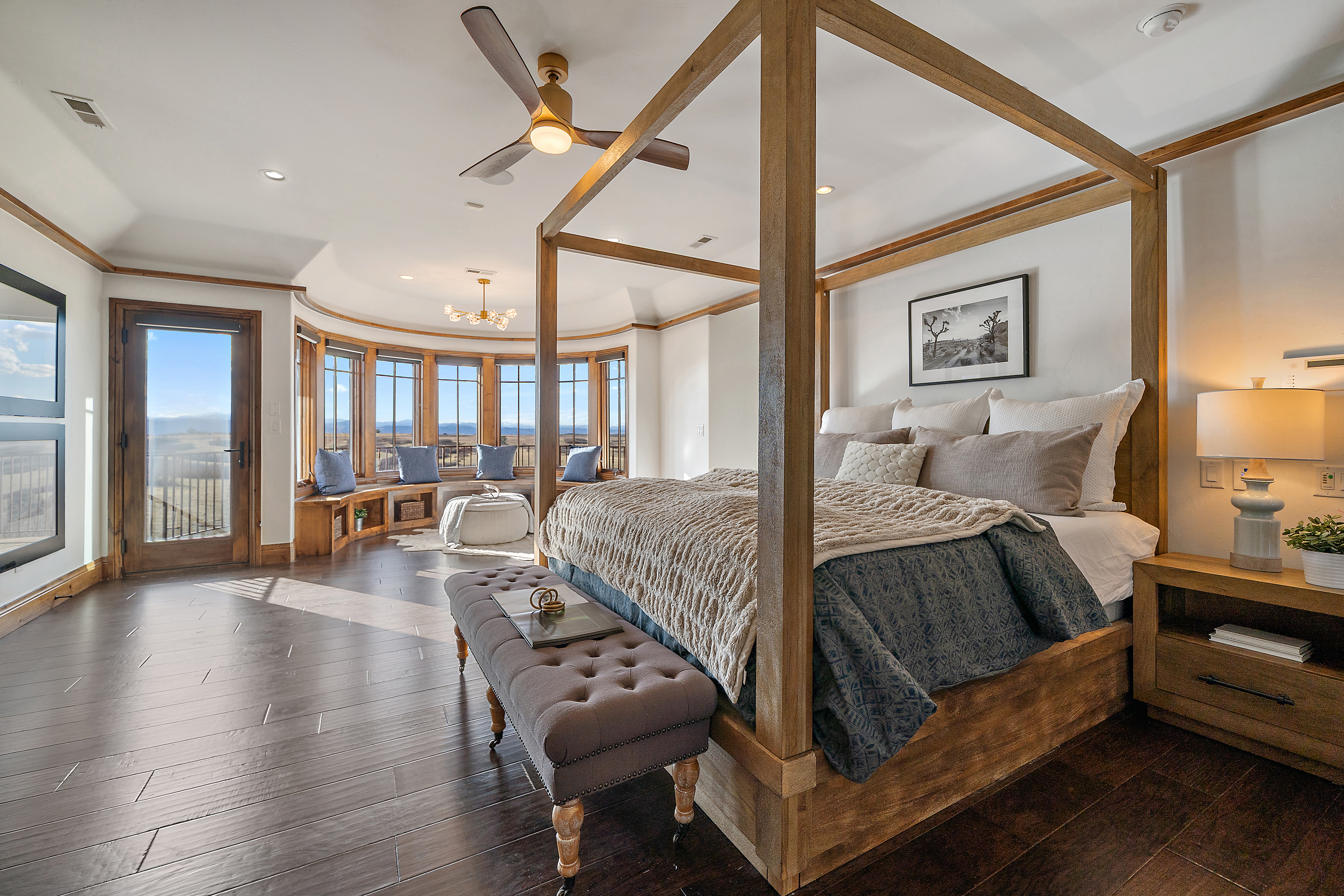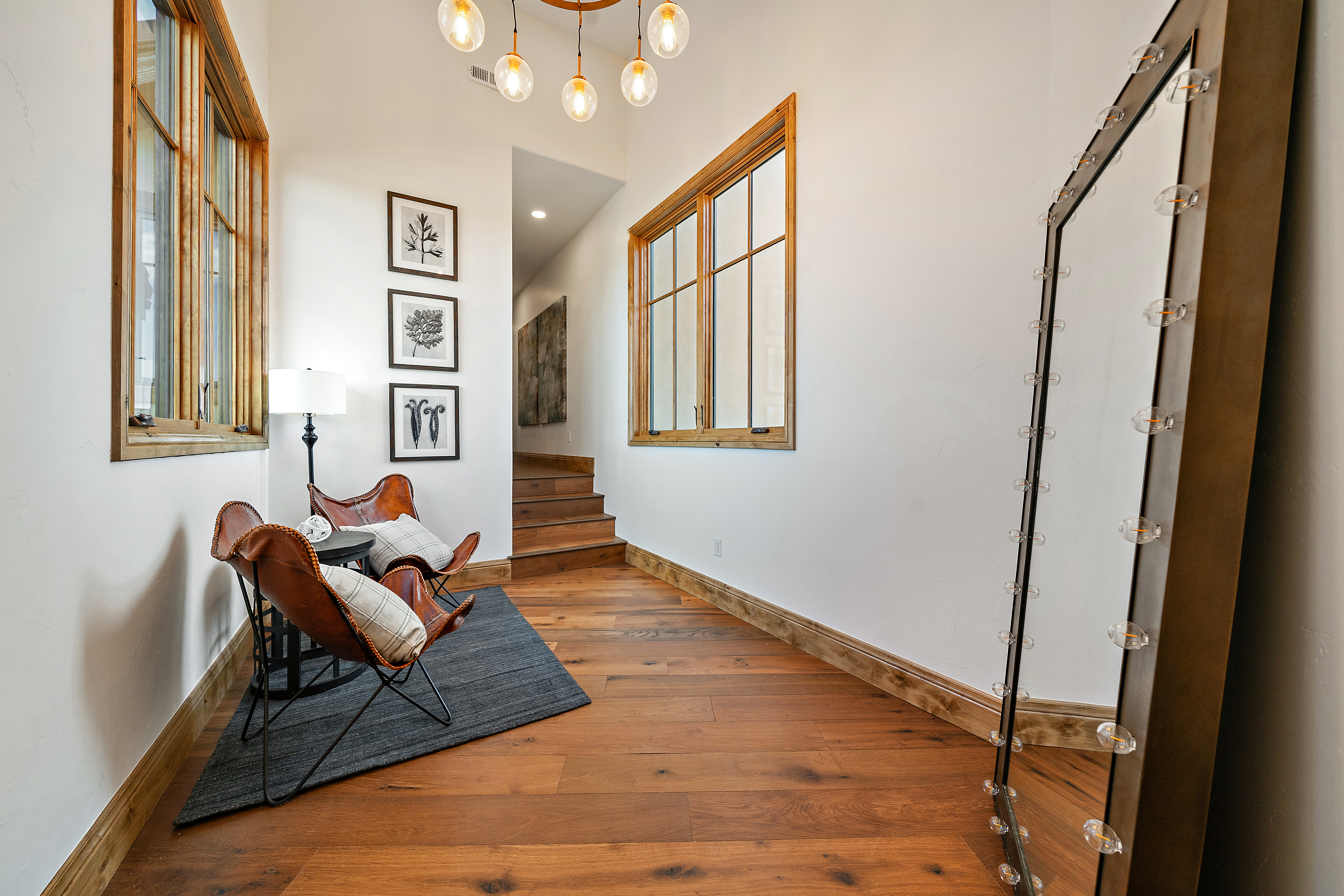 The primary suite sits upstairs behind double doors with a Juliet balcony open to the level below and electronic blinds that lift to a full sweep of mountains. The entire suite was re‑imagined: walls were moved to create a larger, more open walk-in closet with the bed wall reoriented to capture the view. The fully remodeled primary bath is a masterpiece and a true highlight, with an oversized steam shower, custom finishes and an eye‑catching freestanding tub set into a windowed corner that feels like a private spa. Nearby secondary bedrooms include a remodeled Jack and Jill bath between, a third bedroom with en-suite bath and all bedrooms offering walk‑in closets. On the new and improved upper level wing a bedroom is the twin room that can serve multiple purposes with plumbing behind the walls, multiple closets, a sitting area and its own tankless Rinnai water heater, giving a future owner options for guest quarters, a studio or even a small apartment‑style dwelling.
