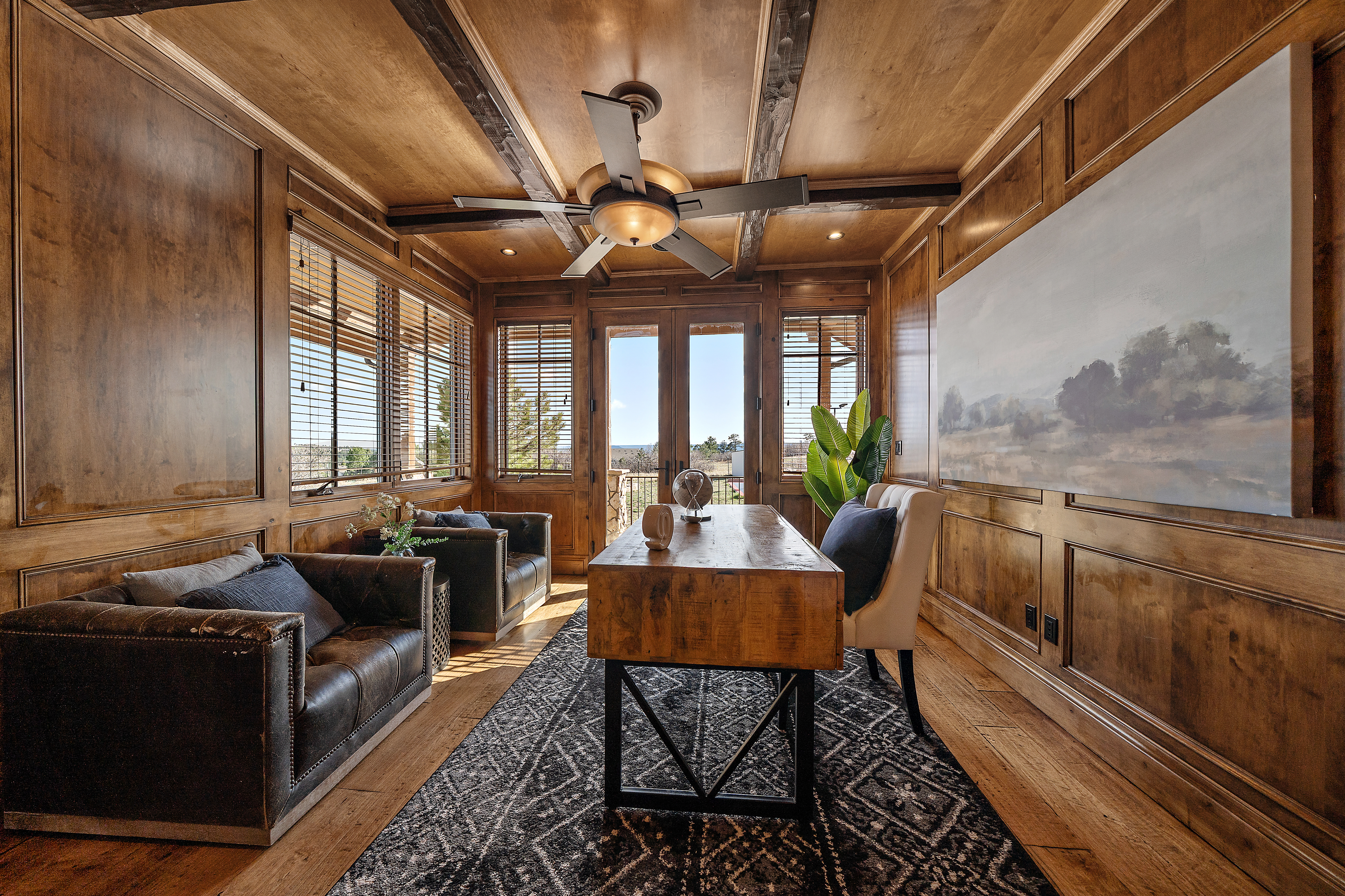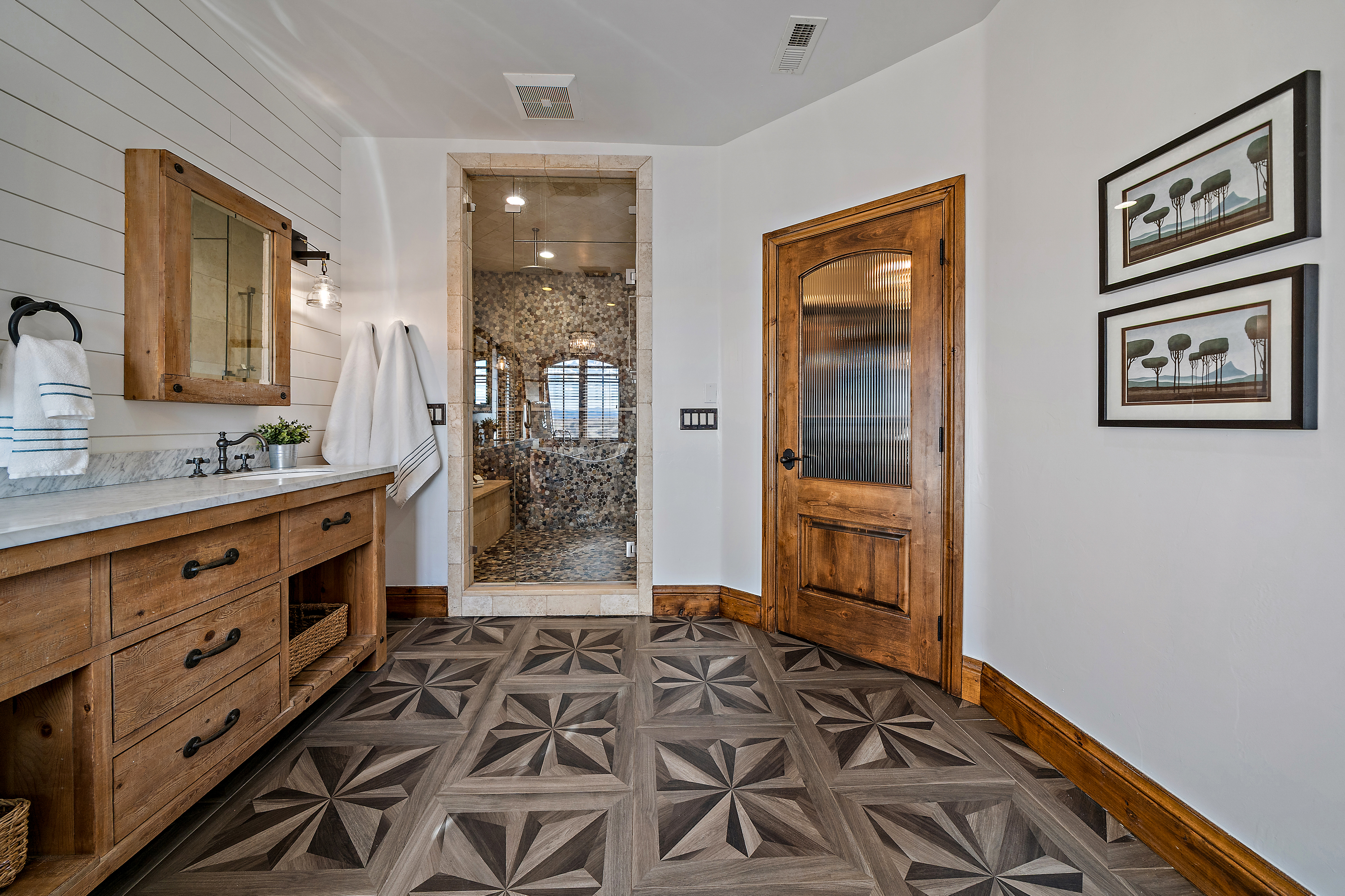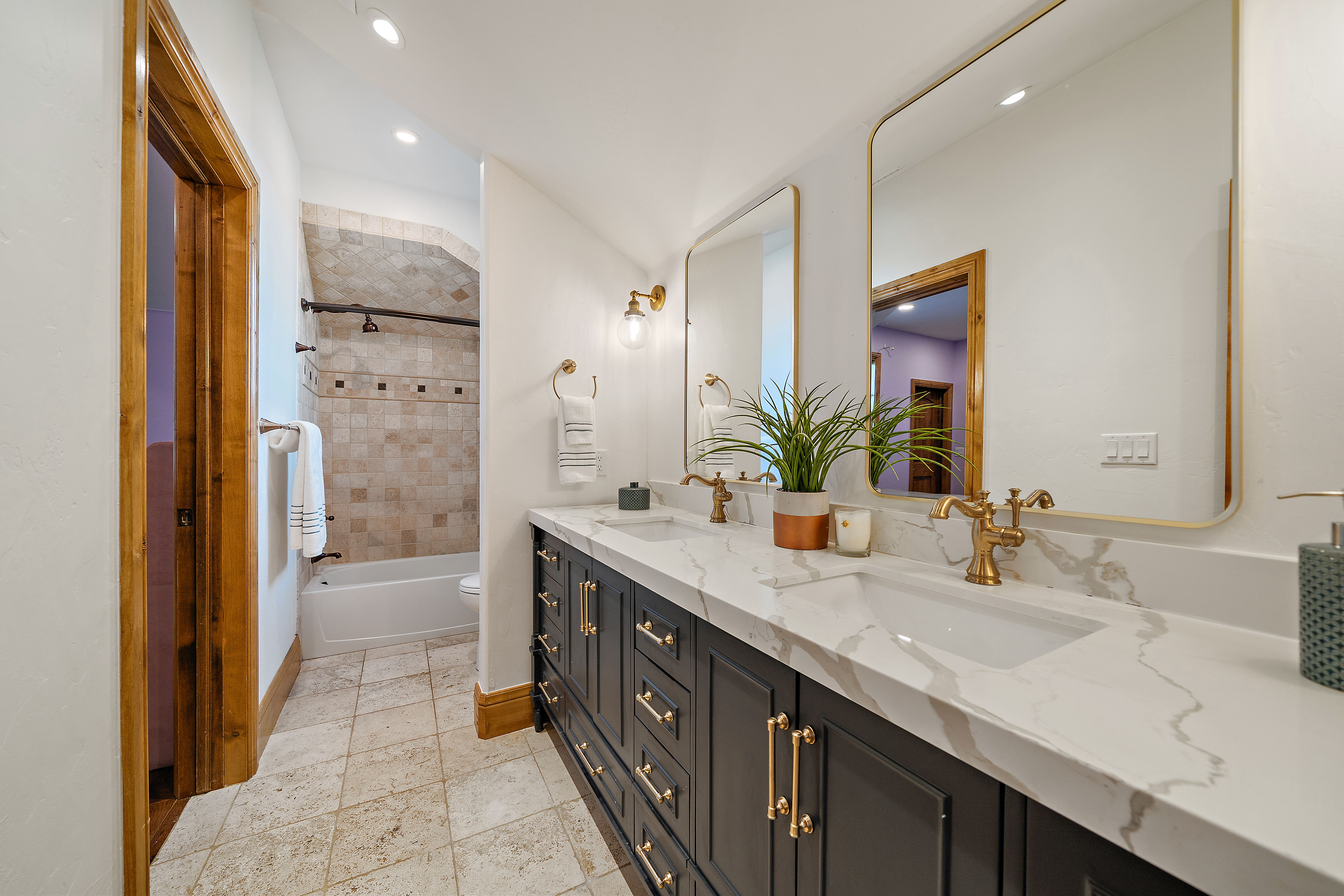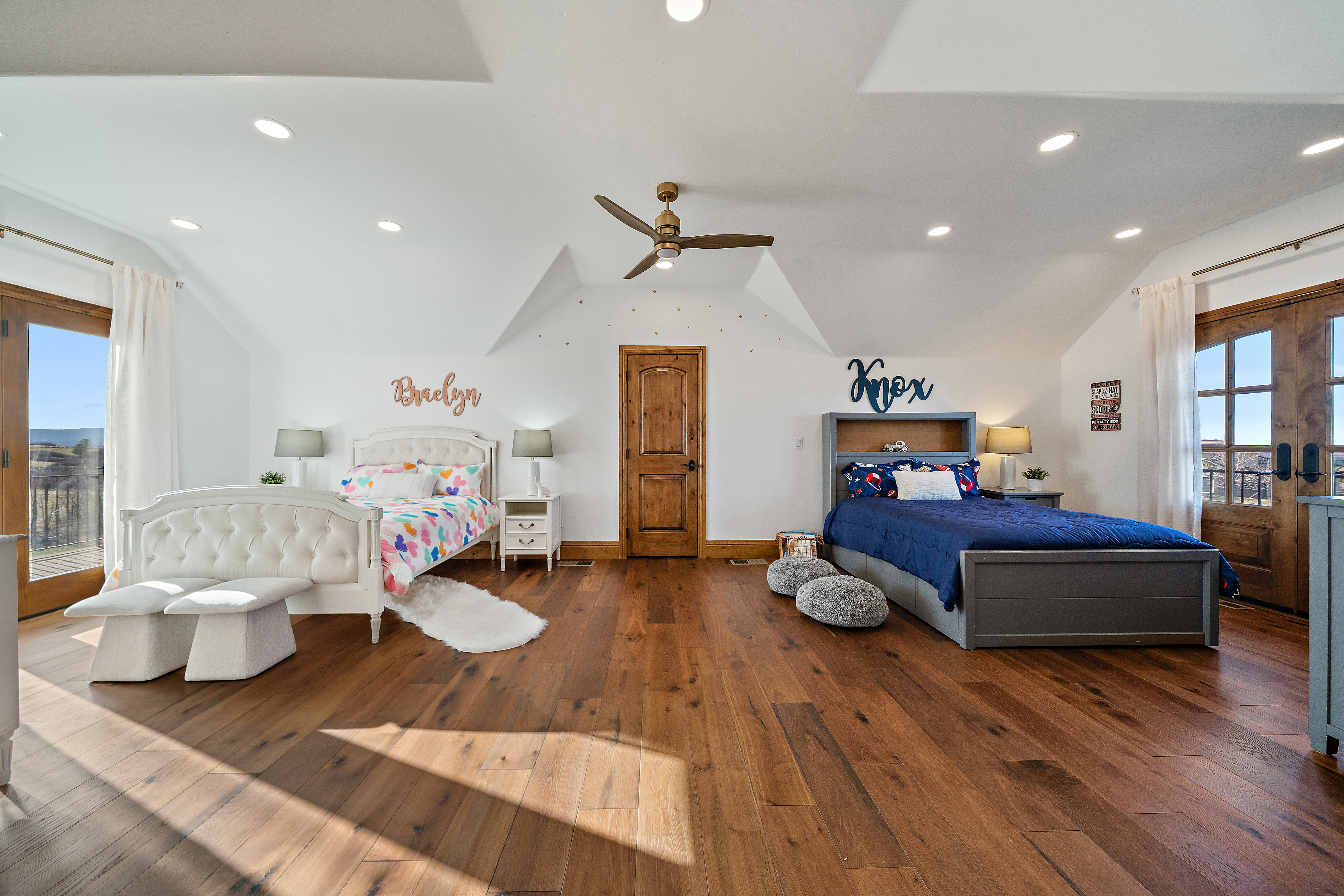 The primary suite sits upstairs behind double doors with a Juliet balcony open to the level below and electronic blinds that lift to a full sweep of mountains. The entire suite was re‑imagined: walls were moved to create a larger, more open walk-in closet with the bed wall reoriented to capture the view. The fully remodeled primary bath is a masterpiece and a true highlight, with an oversized steam shower, custom finishes and an eye‑catching freestanding tub set into a windowed corner that feels like a private spa. Nearby secondary bedrooms include a remodeled Jack and Jill bath between, a third bedroom with en-suite bath and all bedrooms offering walk‑in closets. On the new and improved upper level wing a bedroom is the twin room that can serve multiple purposes with plumbing behind the walls, multiple closets, a sitting area and its own tankless Rinnai water heater, giving a future owner options for guest quarters, a studio or even a small apartment‑style dwelling.