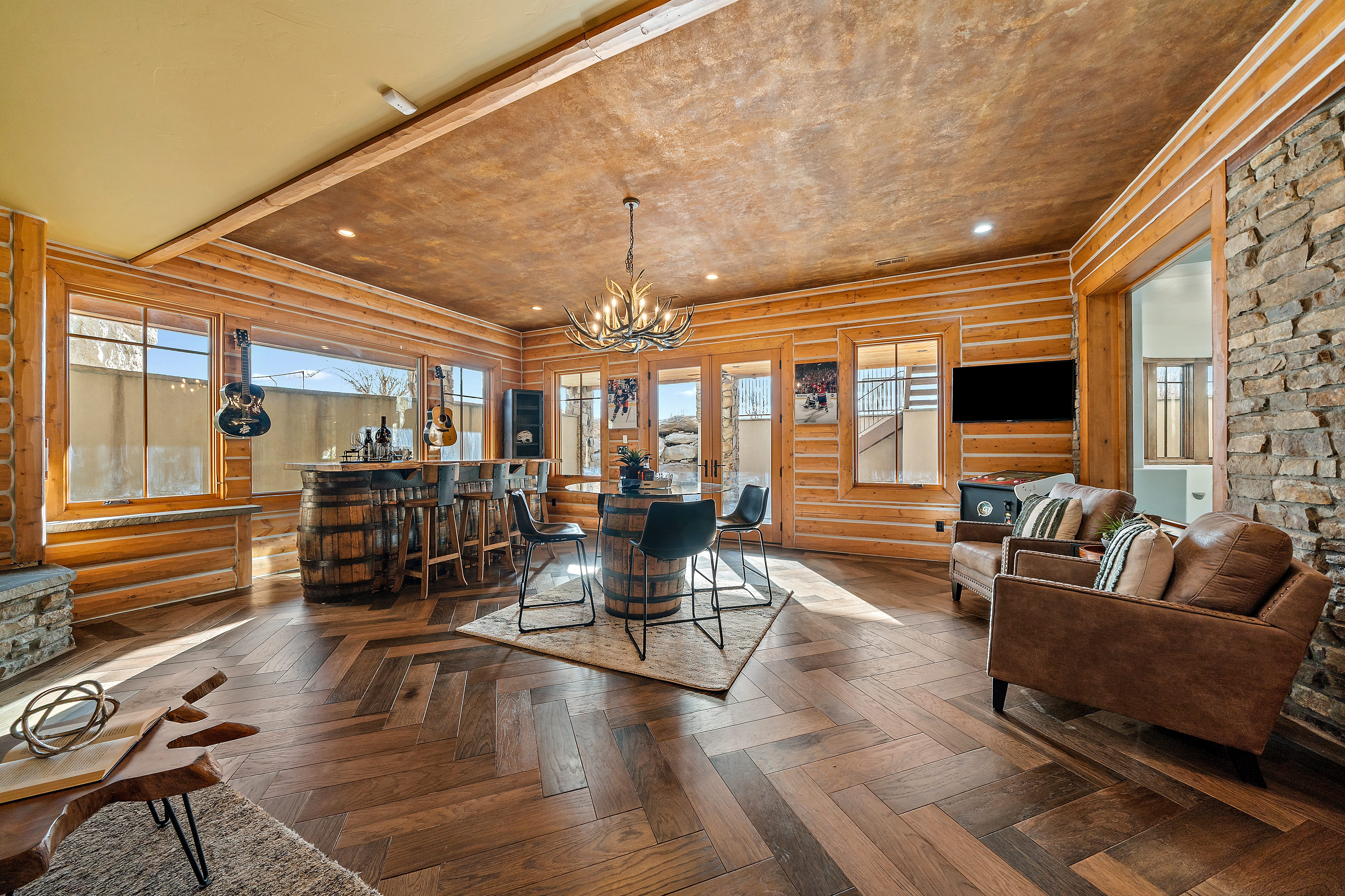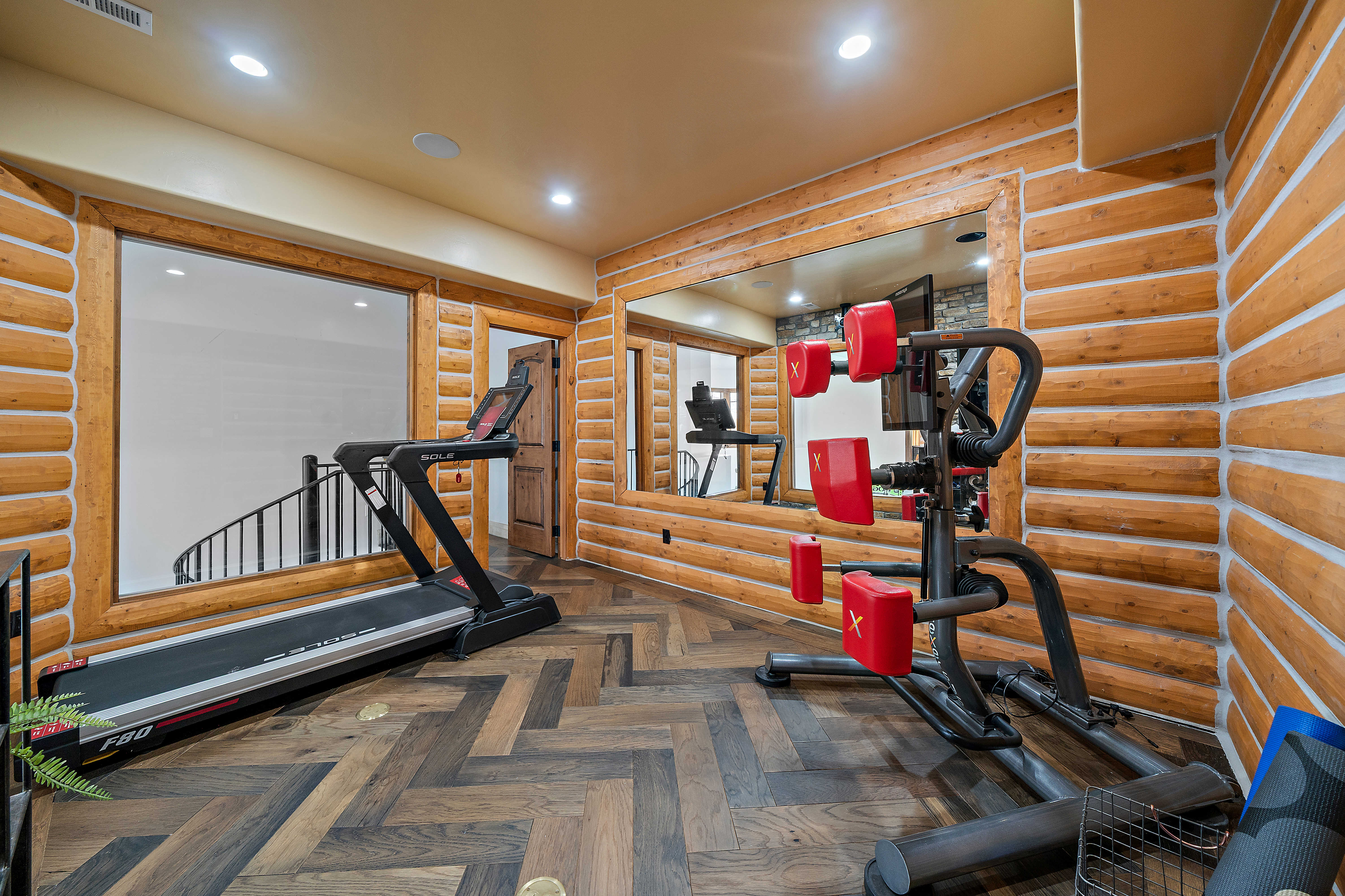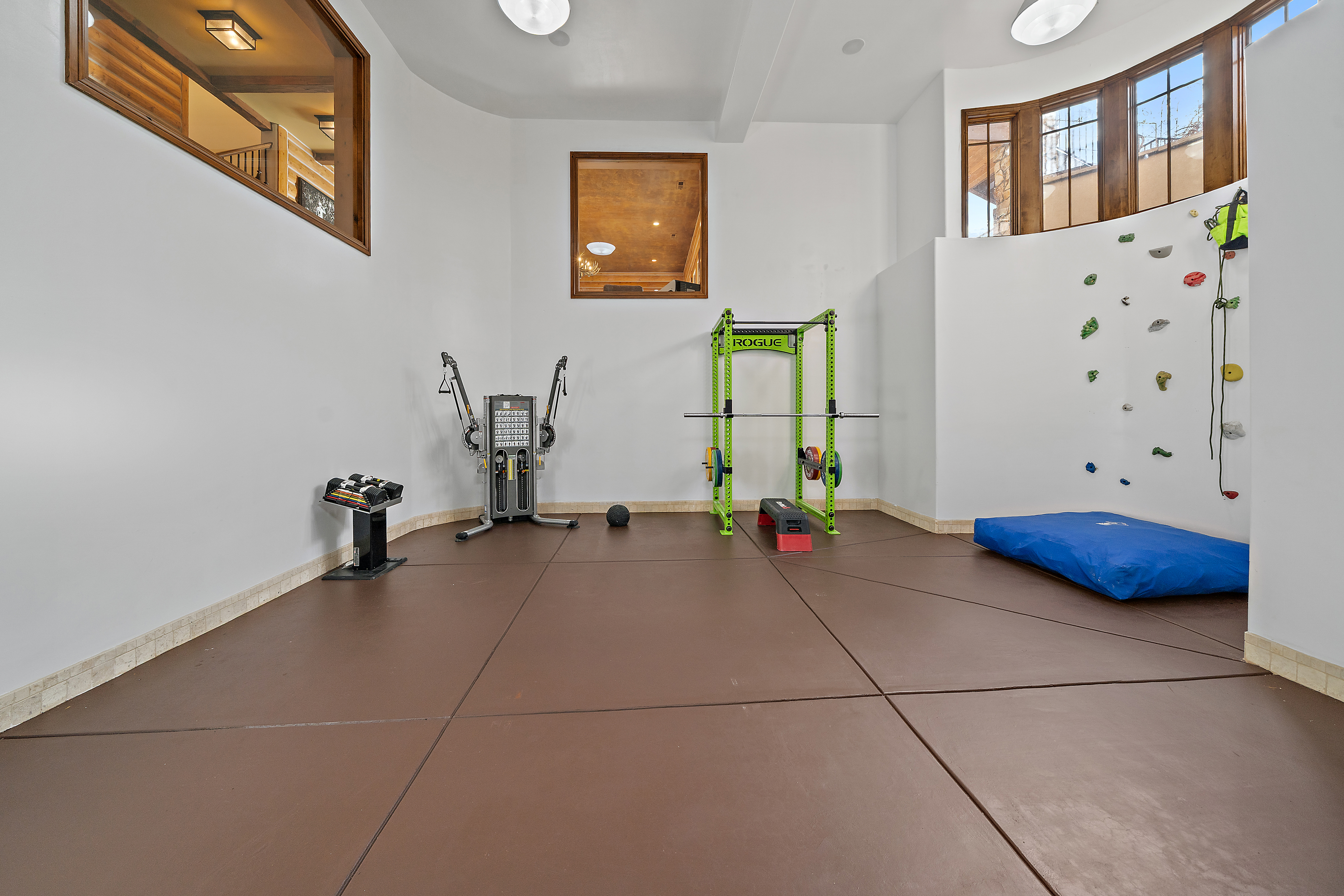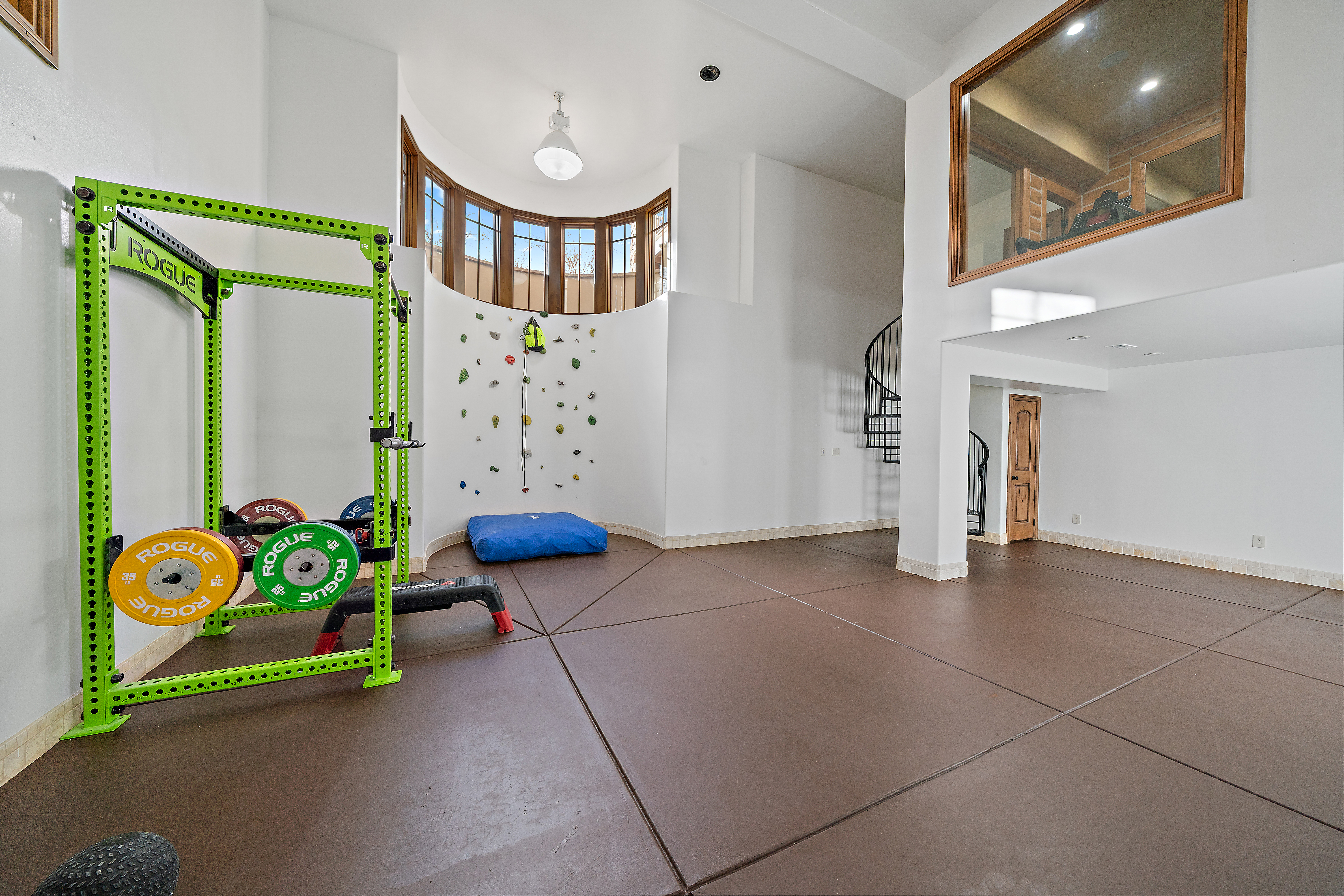 One of the most unique spaces is the sunken sports room. Accessed by a spiral stair and lined with windows that create an upper‑level viewing gallery on three sides with natural light from the west. This tall space currently holds a rock‑climbing wall and gym equipment and is poured in durable concrete flooring. It is easy to imagine it finished as a private training room for serious athletes, a kids’ sports lab with a mini basketball court or nets, an indoor performance gym or a year‑round play zone that keeps the action contained but visible from above. The flexibility of this room, combined with the theater, bar area with barrel details and the lower‑level hangout zones, gives the house a custom resort feel difficult to replicate.