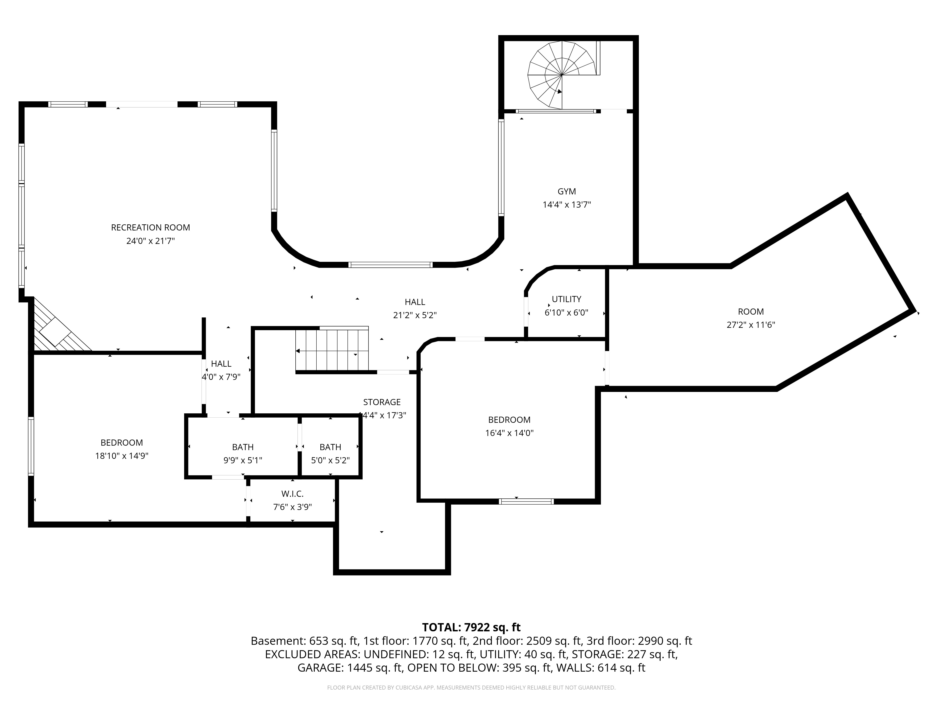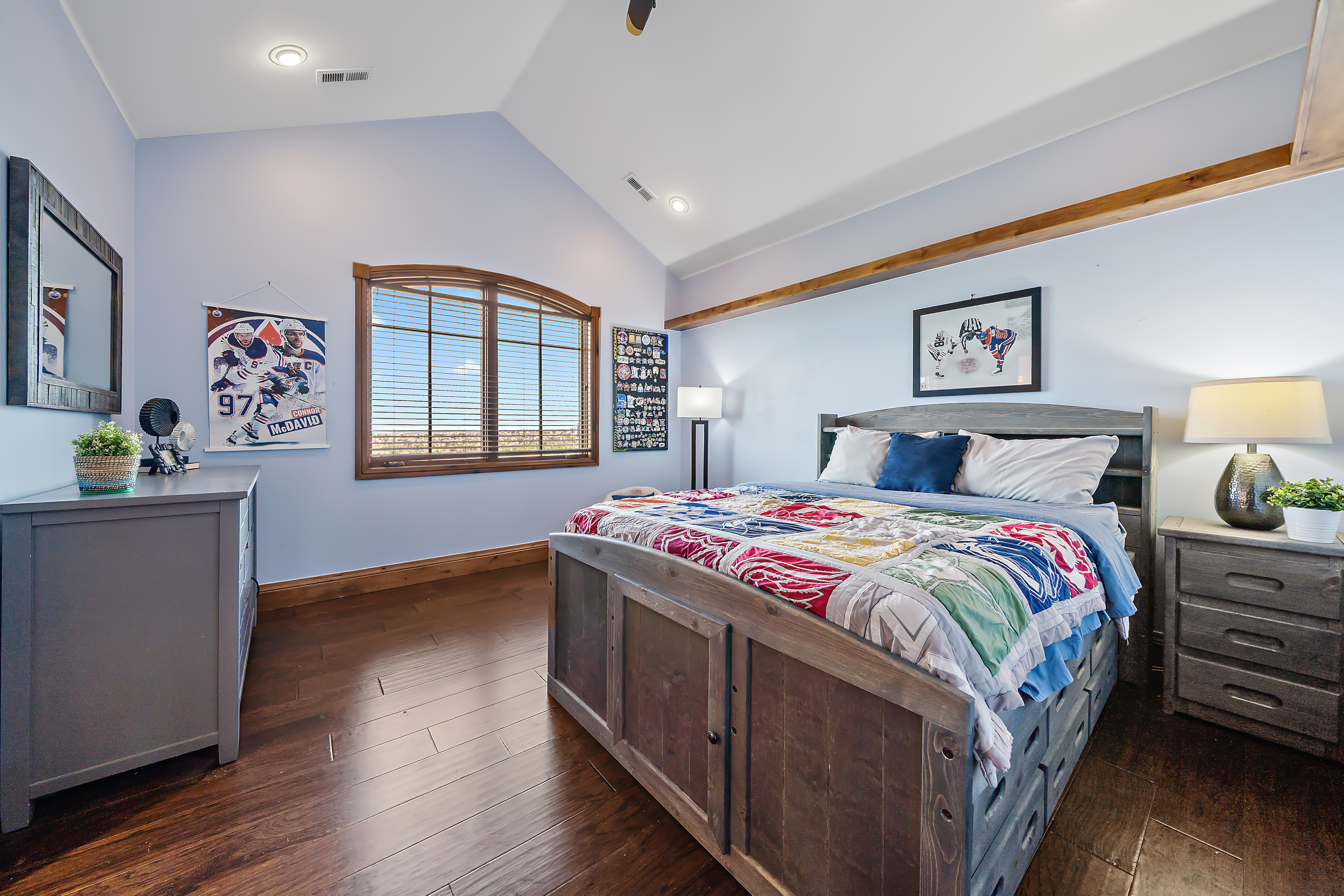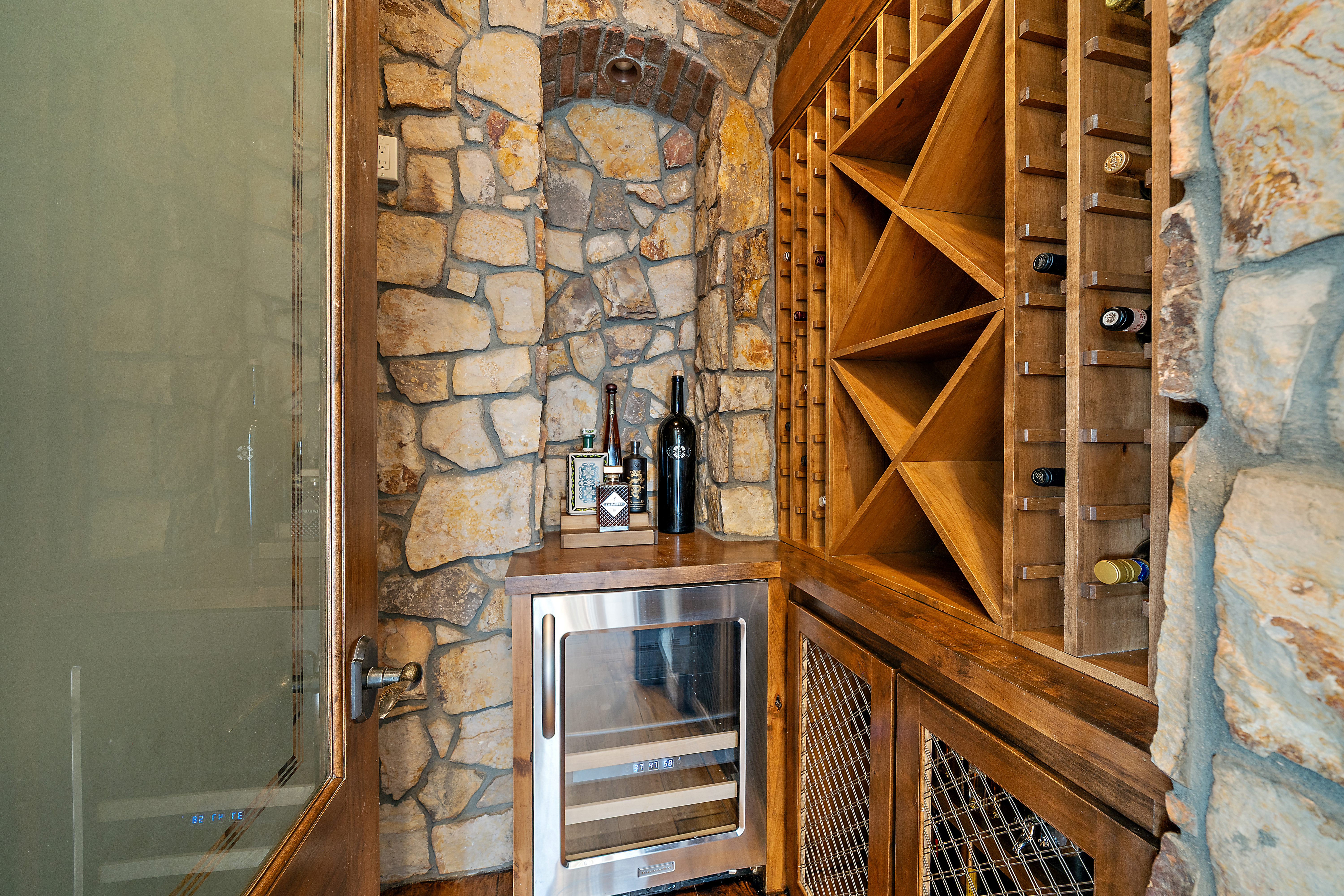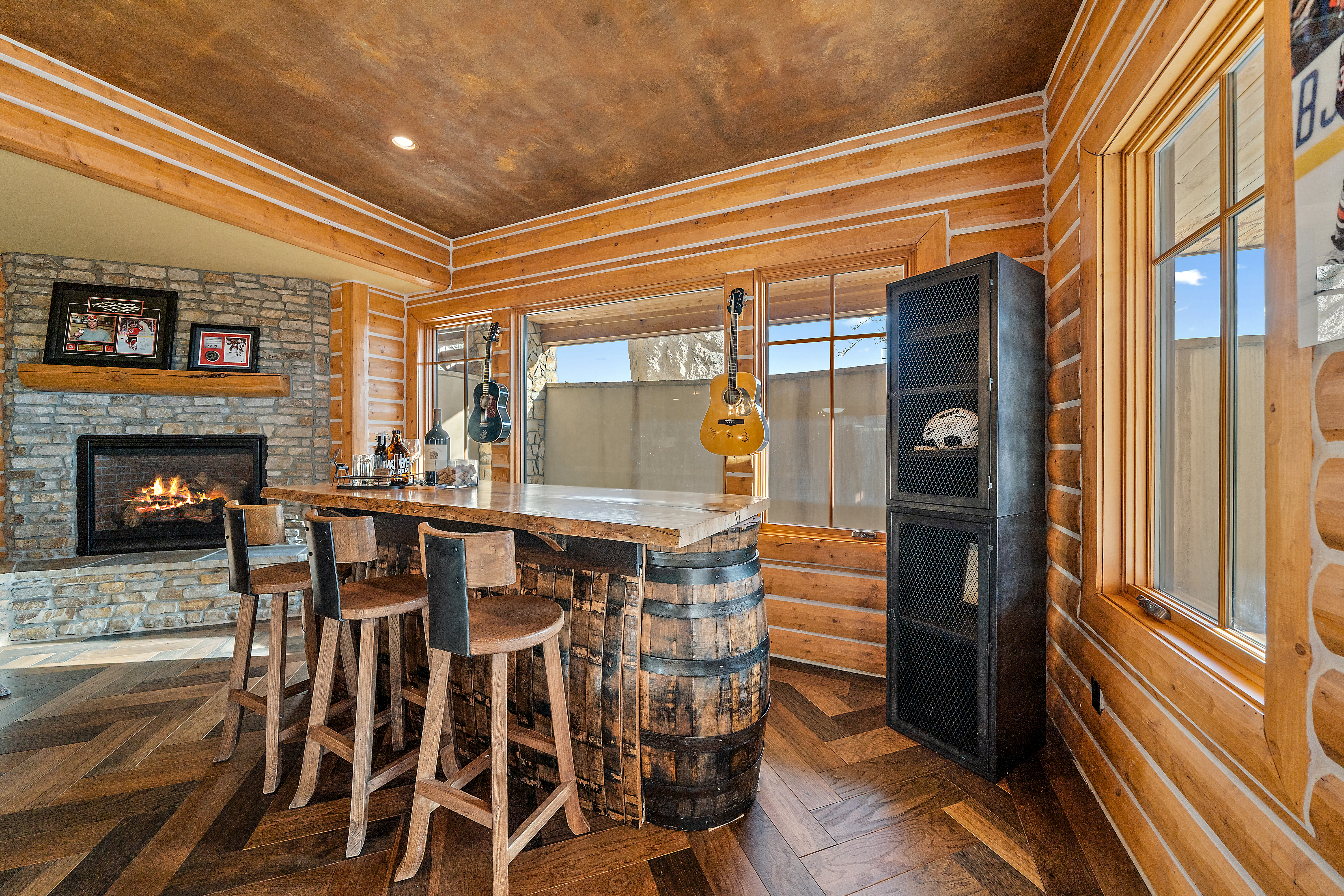 One of the most unique spaces is the sunken sports room. Accessed by a spiral stair and lined with windows that create an upper‑level viewing gallery on three sides with natural light from the west. This tall space currently holds a rock‑climbing wall and gym equipment and is poured in durable concrete flooring. It is easy to imagine it finished as a private training room for serious athletes, a kids’ sports lab with a mini basketball court or nets, an indoor performance gym or a year‑round play zone that keeps the action contained but visible from above. The flexibility of this room, combined with the theater, bar area with barrel details and the lower‑level hangout zones, gives the house a custom resort feel difficult to replicate.